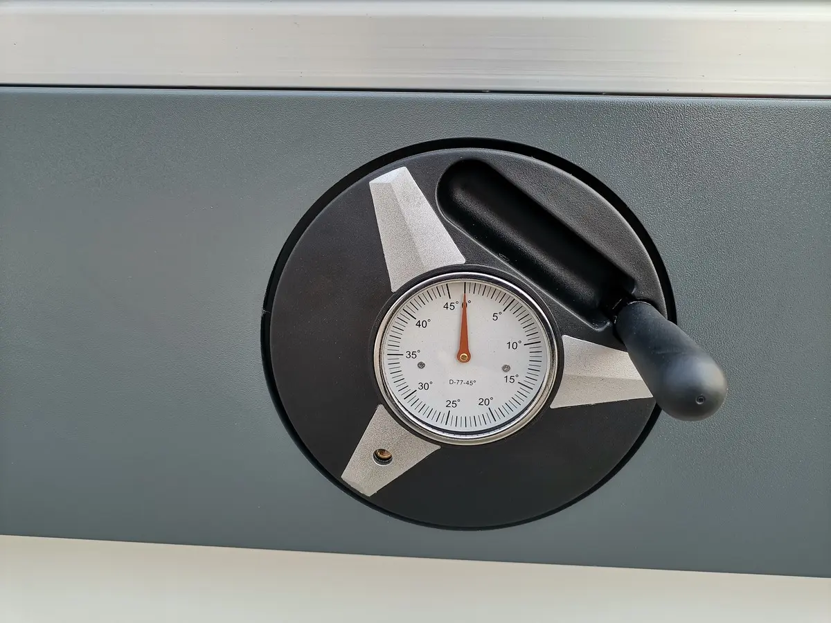 ИНДИКАЦИЯ УГЛА НАКЛОНА ПИЛЬНОГО УЗЛА Станок оснащен системой наклона пильного узла до 45 градусов. Механическая настройка и индикация угла, располагается на передней части станка в зоне работы оператора, что позволяет осуществлять точную и быструю установку. |
