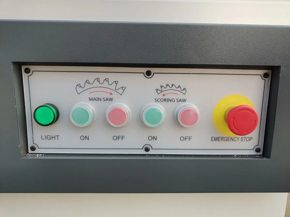 ПУЛЬТ УПРАВЛЕНИЯ Панель управления проста и лаконична. На ней установлены кнопки включения и выключения основного и подрезной пилы, кнопка аварийной остановки станка. |