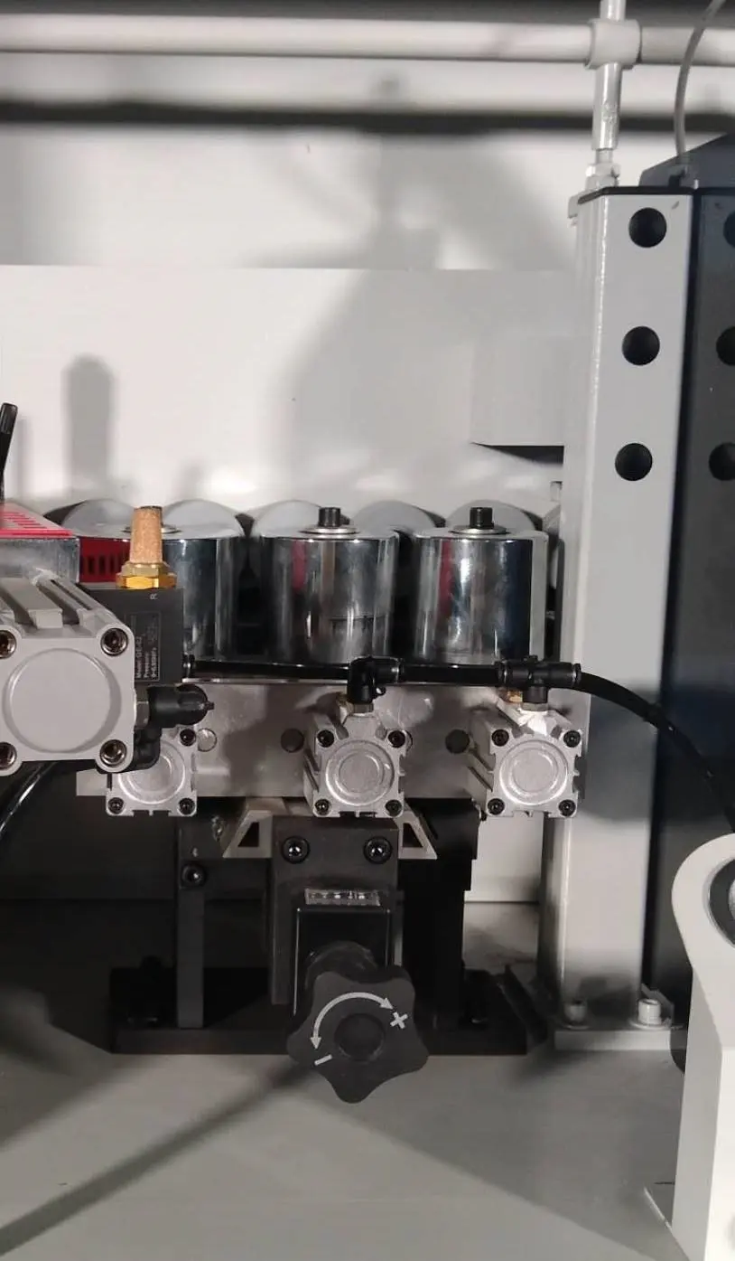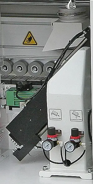 ПРЕСС ГРУППА Состоит из одного большого ролика и двух допрессовочных роликов, которые обеспечивают надежную фиксацию кромочного материала на торец заготовки. На каждом ролике установлен отдельный пневмоцилиндр. 2 ролика из 3-х роликов имеют разный конус, что обеспечивает распределение усилия прижима по толщине детали. Давление на пресс группе задается с помощью пневматики, что гарантирует равномерное распределение усилий на кромку во время приклеивания. |